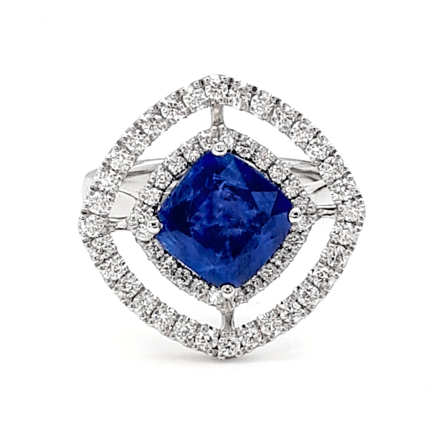 This beautiful cushion cut kyanite gemstone was hand-picked for a private client to celebrate a wedding anniversary. Through our bespoke jewellery service the client, and our expert team, designed a double diamond halo to surround the beautiful Kyanite. This ensured the stone was highlighted and gave the design a unique and stylish look, thus creating a unique heirloom piece for the client to treasure.