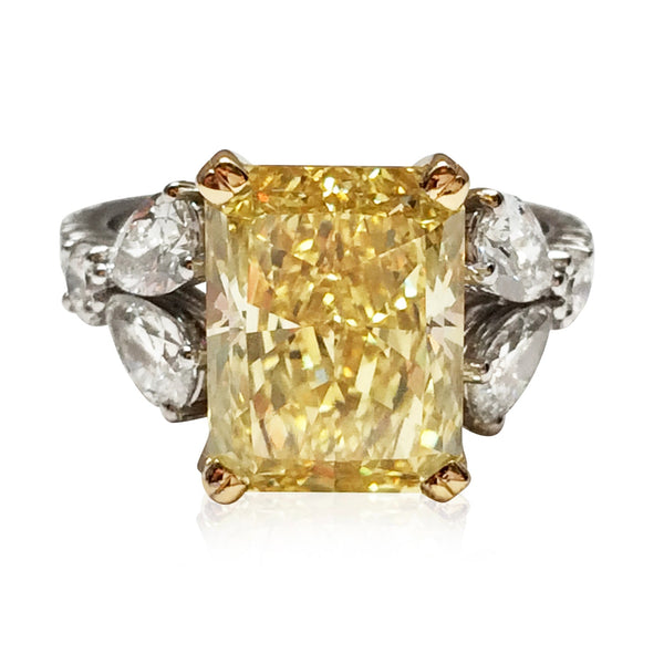 The most exquisite 8.5ct yellow diamond, accompanied by 4 white diamond pear side stones...designed through our bespoke service, this ring is set in mostly 18ct white gold, except the prongs on the yellow diamond which are 18ct yellow gold so as to better complement the diamond's colour.