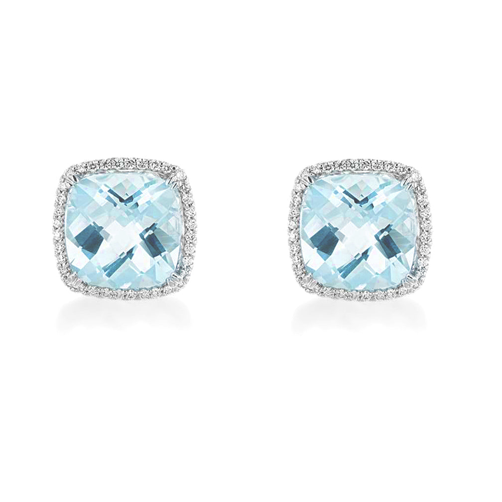 Our Exquisite Aquamarine Diamond Halo Earrings feature two beautiful blue aquamarines and are surrounded by glacial white diamonds.