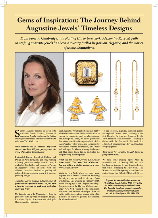 Alexandra and the team are thrilled to see we've been featured in the Surrey Magazine this December. This edition features an in depth article discussing Alexandra's success over the last few years and even touches upon the creation of our newest collection.