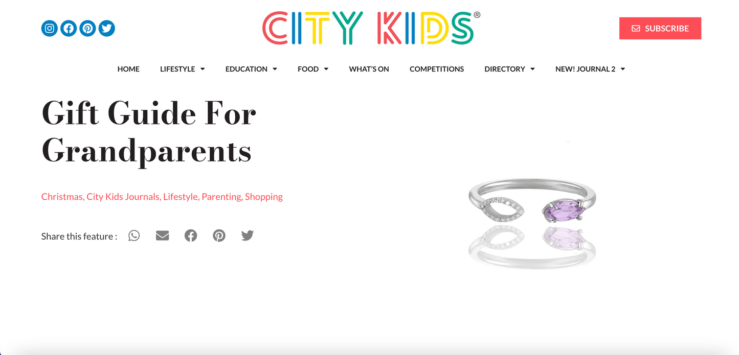 Augustine Jewels are delighted to have been featured in the City Kids' Magazine. Our English Gardens Purple Amethyst and Diamond Ring has been included in their "Gift Guide For Grandparents". Read more over on the City Kids' website.