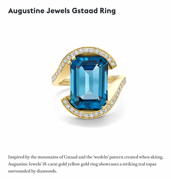 We're utterly thrilled to be featured in BOAT International's latest article all about Showstopping Christmas Gifts! It's wonderful to have our new Gstaad collection included among such luxurious brands - the Teal Topaz and Diamond Wedeln Ring is breathtaking.