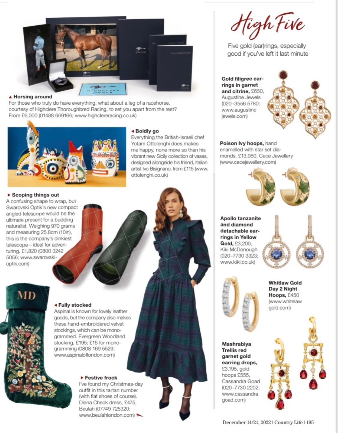 Country Life has featured Augustine Jewels in their latest Christmas edition. We're over the moon to be included in such a prestigious publication! It's such an honour to have our beautiful Andalusian Yellow Gold Filigree Earrings in Garnet and Citrine featured on their Christmas Wishlist.