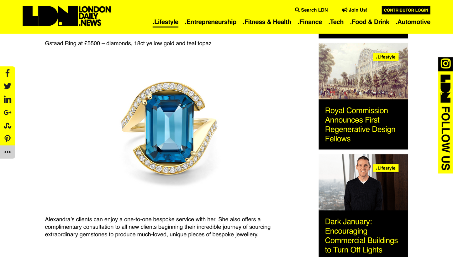We're so happy to have been featured in The London Daily News back in December! It's amazing to see how well received our new Gstaad collection is, we've noticed that a lot of the Press can't get enough of the Teal Topaz and Diamond Wedeln Ring.
