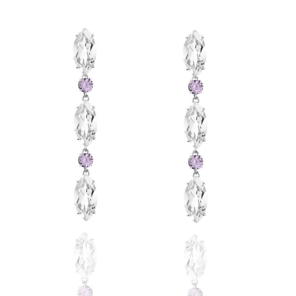 Marquise-cut White Topaz and round Purple Amethyst Drop Earrings. Set in solid sterling silver. White Topaz measures 10mm by 5mm, 12mm by 6mm and 14mm by 7mm, respectively. Purple Amethyst rounds measure 4mm. Total length of the earring is 49mm.