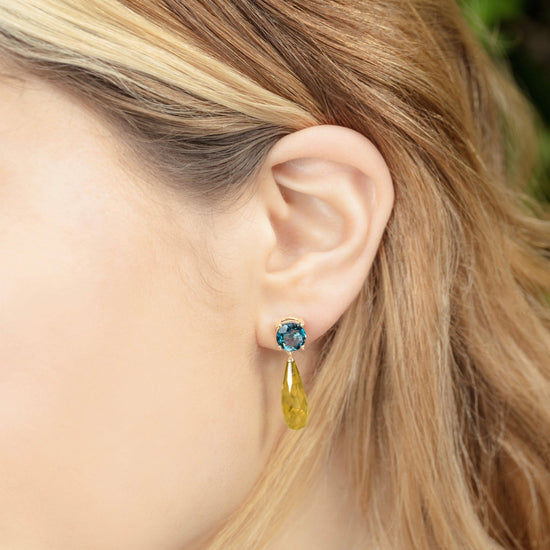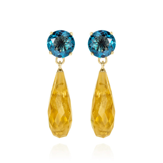 Our Teal Topaz and Citrine Gold Drop Earrings combines the natural-coloured August and November birthstones together in a solid 9ct Yellow Gold setting.