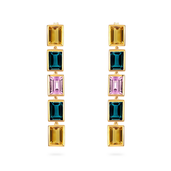 Featuring 2 Citrine, 2 London Teal Topaz and 1 Purple Amethyst, all 6x8mm Octagon cuts, these drop earrings have a total length of 5.5cm and really capture the movement of the stones. These earrings have a combined total carat weight of 16.18ct.