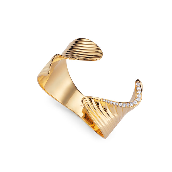 The statement piece from our Santorini Collection: our Gold and Diamond Swirling Cuff. Glittered with Lab Grown Diamonds and adorned with the delicate Gold Shell Detailing featured throughout this collection, this Cuff is one of our boldest designs yet.
