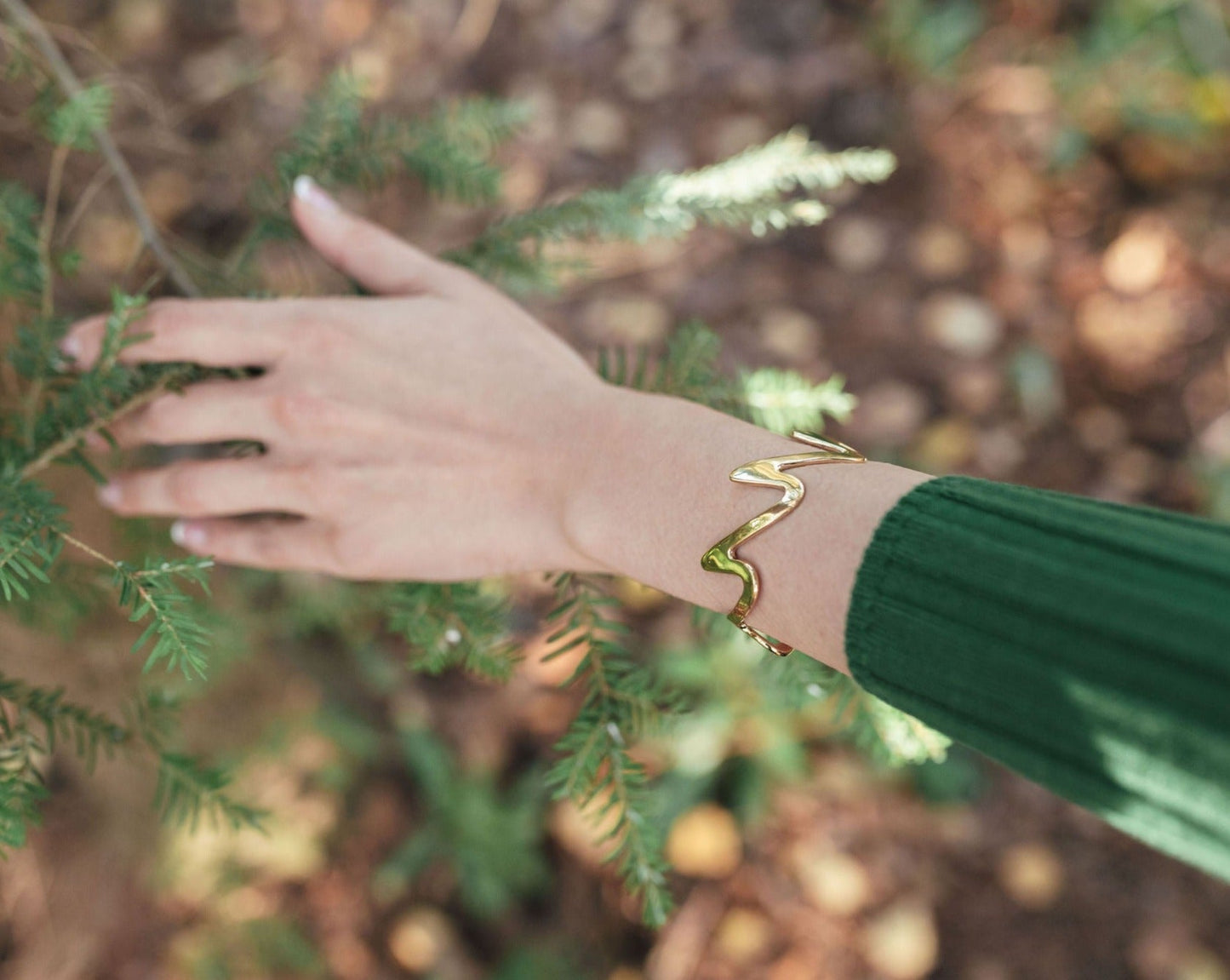 Inspired by the beautiful patterns formed when performing the Wedeln Skiing technique, this bangle mirrors the wonderful outlines left imprinted on the snow. Made in solid 18ct Yellow Gold, this bangle shimmers in the light and will add a layer of sophistication to any outfit.