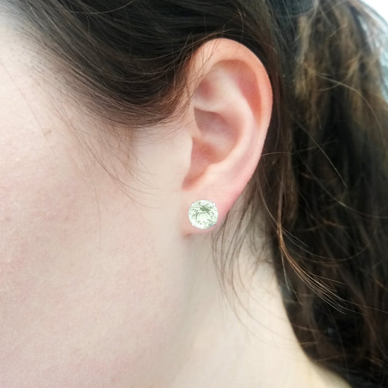 These silver sky green amethyst stud earrings from our South of France inspired Jewellery Collection are simply designed, allowing the stunning natural green amethyst stones to be the centre of attention whilst maintaining that luxury jewellery feel. Day or night, the round cut green amethyst gemstone sparkles in the most beautiful way, and complements the other green amethyst jewellery in the South of France inspired Jewellery Collection perfectly.
