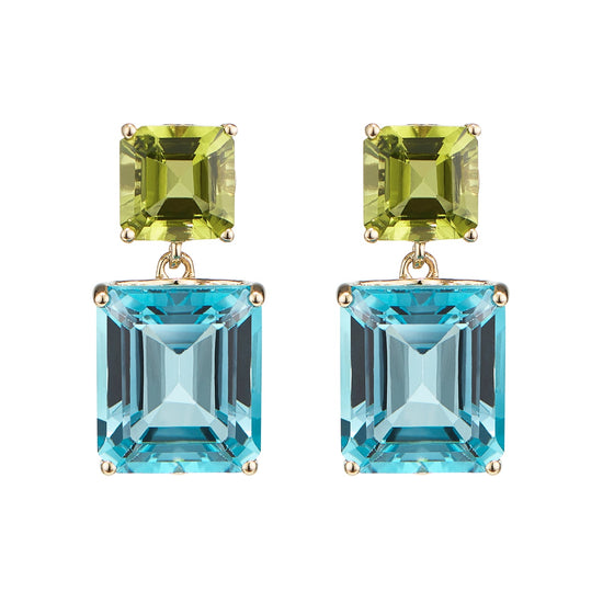 Octagon Gold Drop Earrings in Peridot & Blue Topaz