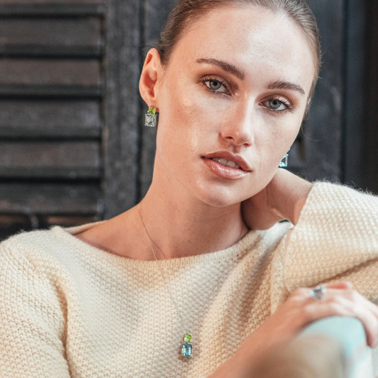 This luxury gemstone jewellery piece perfectly complements the Peridot and Blue Topaz Pendant Necklace and Peridot & Blue Topaz Octagon Ring from the Luxury Jewellery London designed Andalusian Collection of Augustine Jewels.