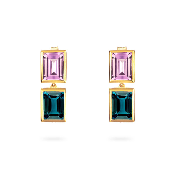 Featuring Purple Amethyst and Teal Topaz all 6x8mm Octagon cuts, these drop earrings have a total length of 2.2cm and really capture the movement of the stones.