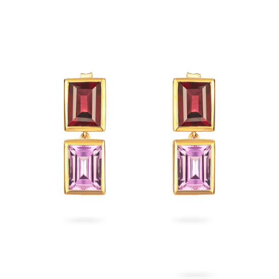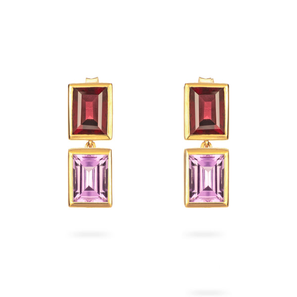 Featuring Rhodolite and Purple Amethyst, all 6x8mm Octagon cuts, these drop earrings have a total length of 2.2cm capturing the movement of the stones.