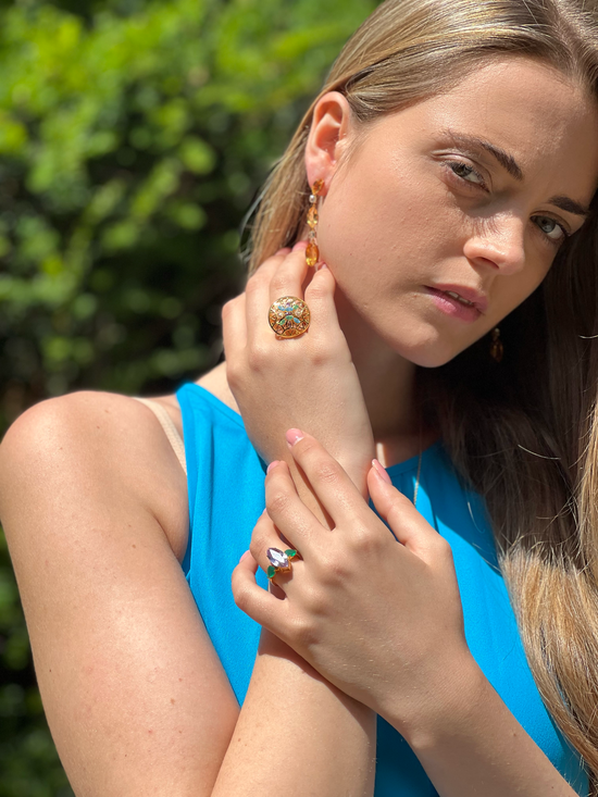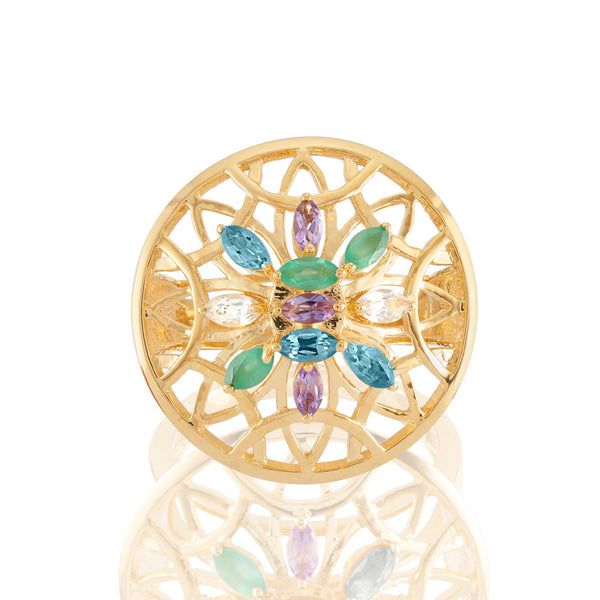 The Colours Of Summer Ring is made with agate, purple amethyst, citrine and white topaz, gold plates. The exquisite gemstones are placed to resemble a flower. For a pop of colour to simple outfits or a finishing touch to fancy outfits for special events, this ring is the best fit.