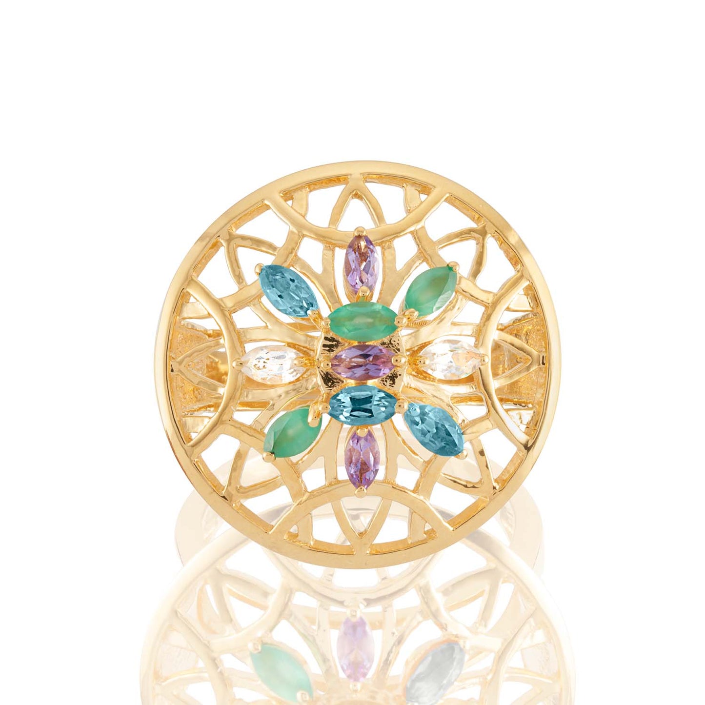 Sterling silver with 18ct yellow gold plate statement ring, decorated with Purple Amethyst, Blue Topaz, White Topaz and Green Agate. Width of the ring is 1.8cm.