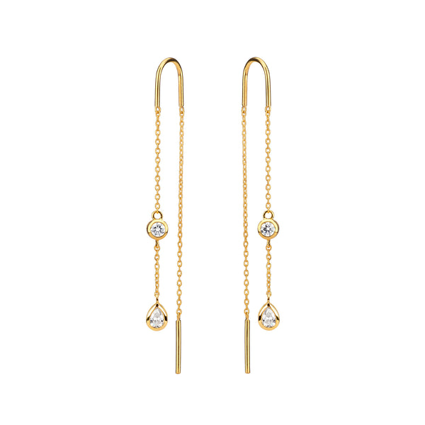 Minimalist and lightweight, these Delicate Gold Diamond Threader Earrings are an airy addition to the exclusive New York Collection. The pear and round cut lab-grown diamonds dangling from yellow gold chains evoke the elegance of Art Deco and add a touch of sophistication to any ear stack. With their timeless allure and modern design, these earrings are an exquisite choice both for celebrating life's most cherished moments and for everyday wear.